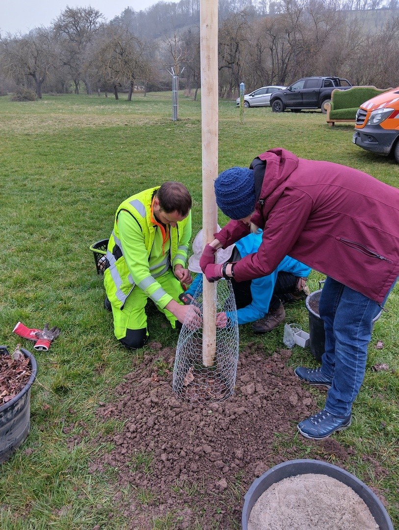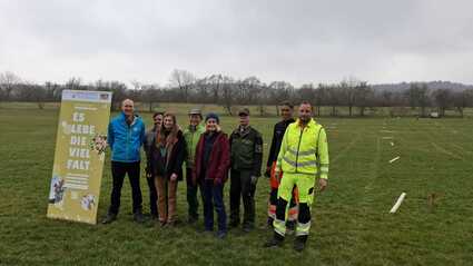 Bereit zum Start der Versuchspflanzung (Foto von links): Florian Kleinschroth (Streuobstberater untere Naturschutzbehörde), Christian Weide (Baumwart), Anna Rühl (Landschaftspflegeverband), Clemens Nähr (Baumwart), Helga Kerwagen (Landschaftspflegeverband), Klaus Huprich (Baumwart), Jörg Petzold (Stadtgärtnerei Burgbernheim) und Manuel Seeg (Stadtgärtnerei Burgbernheim).