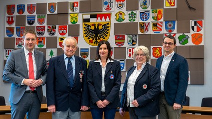 Foto: Auszeichnung für die jahrzehntelange ehrenamtliche Leistung im Bayerischen Roten Kreuz (von links): Landrat Dr. Jürgen Ludwig, Wilhelm Ebersberger, Anja-Manuela Barkholz, Anna-Maria Wöhl und Christian Bernhard.