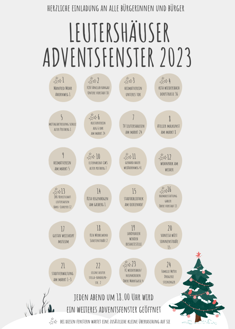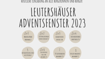 Einen Adventskalender in der ganzen Stadt? Das gibt’s dieses Jahr wieder in Leutershausen. Täglich um 18 Uhr wird ein neues Fenster geöffnet. Bei der Aktion beteiligen sich Privatpersonen, aber auch das Gewerbe und zum Beispiel das Seniorenheim. Das Ziel der Aktion ist es, in der dunkleren Jahreszeit zusammen zu kommen und die Gesellschaft zu genießen. Die Fenster sind dabei ganz unterschiedlich geschmückt, erklärt Bürgermeister Markus Liebich: