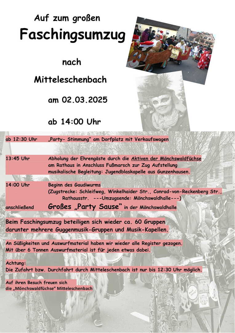 Die Narren bereiten sich vor auf das große Faschingswochenende. Auch in Mitteleschenbach ist Party-Stimmung angesagt. Auch beim großen Faschingsumzug am kommenden Sonntag (2.3.). Um halb eins beginnt die Party-Stimmung bereits am Dorfplatz. Ab 14 Uhr zieht sich der große Gaudiwurm dann durch die Stadt bis zur Mönchswaldhalle, wo auch dort im Anschluss kräftig weitergefeiert wird. Rund 60 Gruppen sind beim Umzug heuer mit am Start. Darunter auch mehrere Guggenmusik-Gruppen. Übrigens: Über sechs Tonnen an Süßigkeiten und Auswurfmaterial werden dieses Jahr in Mitteleschenbach verteilt.