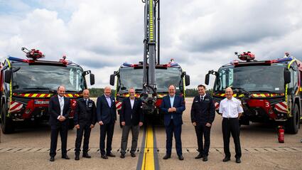 Foto: (v.l.n.r) Markus Pletsch, Vertrieb Rosenbauer, Marcus Exner, stellv. Leiter Flughafenfeuerwehr, Jan C. Bruns, Geschäftsführer AirPart, Dr. Michael Hupe, Flughafengeschäftsführer, Christian Vogel, Bürgermeister Stadt Nürnberg, Matthias Reumann, Leiter Flughafenfeuerwehr und Hans-Peter Reißmann, stellv. Dienststellenleiter der Berufsfeuerwehr Nürnberg vor den neuen Flugfeldlöschfahrzeugen des Airport Nürnberg.