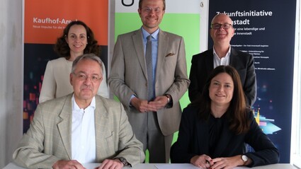 Foto: Unterzeichnung des Mietvertrags für die Ladenfläche im Kaufhof. Sitzend: Claus Fleischmann, Dienststellenleiter Liegenschaftsamt Stadt Nürnberg, Daniela Bender, stellvertretende Leiterin der Regionalvertretung Mittelfranken der Immobilien Freistaat Bayern, stehend: Wirtschafts- und Wissenschaftsreferentin Dr. Andrea Heilmaier, Oberbürgermeister Marcus König, Prof. Dr. Michael Huth, Gründungspräsident der Technischen Universität Nürnberg